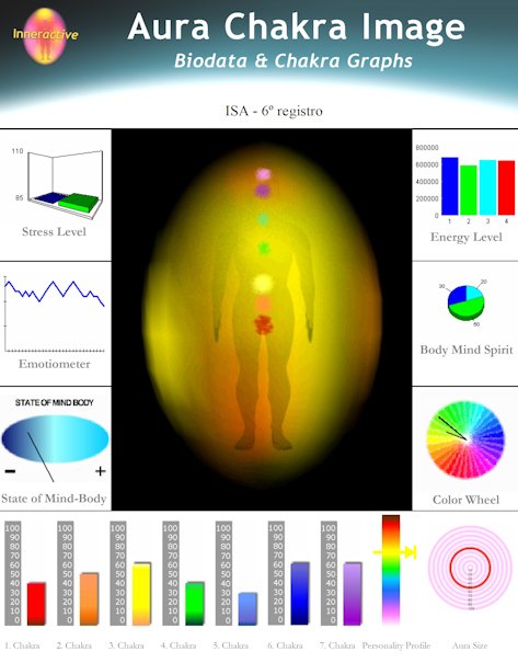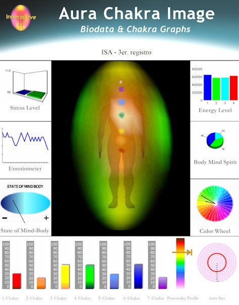 Nuevamente el aura ha cambiado de color. El segundo y tercer "chakras" bajan un poco (10 puntos menos respectivamente). El tercero y el séptimo permanecen sin cambios y primero, cuarto y sexto aumentan en la misma proporción (20 puntos más cada uno).
