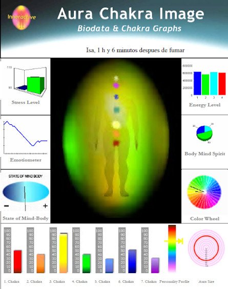Una hora después, el aura ha vuelto a cambiar de color. El cuarto y el sexto "chakras" disminuyen 20 puntos cada uno. El primero y el quinto suben 10 puntos respectivamente. El séptimo aumenta 30 puntos. El segundo y el tercero continúan igual.