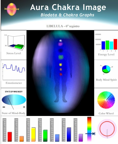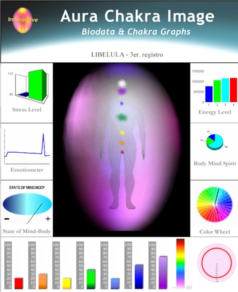Media hora después, nuevamente el aura ha cambiado de color. El primer y el cuarto "chakras" baja un poco (10 puntos menos cada uno). El quinto y sexto aumentan 10 puntos respectivamente, el séptimo sube 40 puntos y los demás descienden en distinta proporción: el primero y el cuarto 10 puntos menos, el tercero 20 puntos menos y el segundo 40 puntos menos