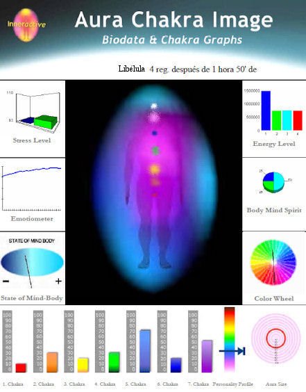 Una hora después, el aura ha vuelto a cambiar de color. El primer y el cuarto "chakra" han subido 10 puntos, el segundo continúa igual. Los demás bajan en distinta proporción: el tercero, quinto y sexto descienden 10 puntos cada uno, mientras que el séptimo baja 50 puntos.