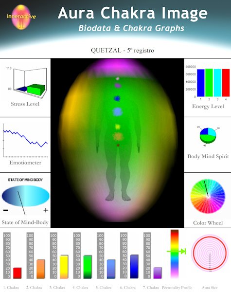 La última medición, un poco más de una hora después, el color del "aura" se ha vuelto a modificar, el primero y el séptimo "chakras" descienden un poco (10 puntos), el tercero baja más (30 puntos), suben levemente el segundo, cuarto y sexto (10 puntos más) y sube más el quinto (20 puntos). El promedio final es 4.28 puntos mayor que el inicial; lo cual demuestra que los efectos positivos continúan, considerándose positiva la utilización del Cannabis en el sujeto experimental que eligió el seudónimo de Quetzal. Esto en lo que respecta a las mediciones llevadas a cabo con el Sistema Auravisión. (Cabe notar que Quetzal no pudo quedarse a la quinta y última medición que planeamos para todos los sujetos experimentales, por lo que no contamos con el registro de sus valores ya fuera de los efectos del Cannabis.)