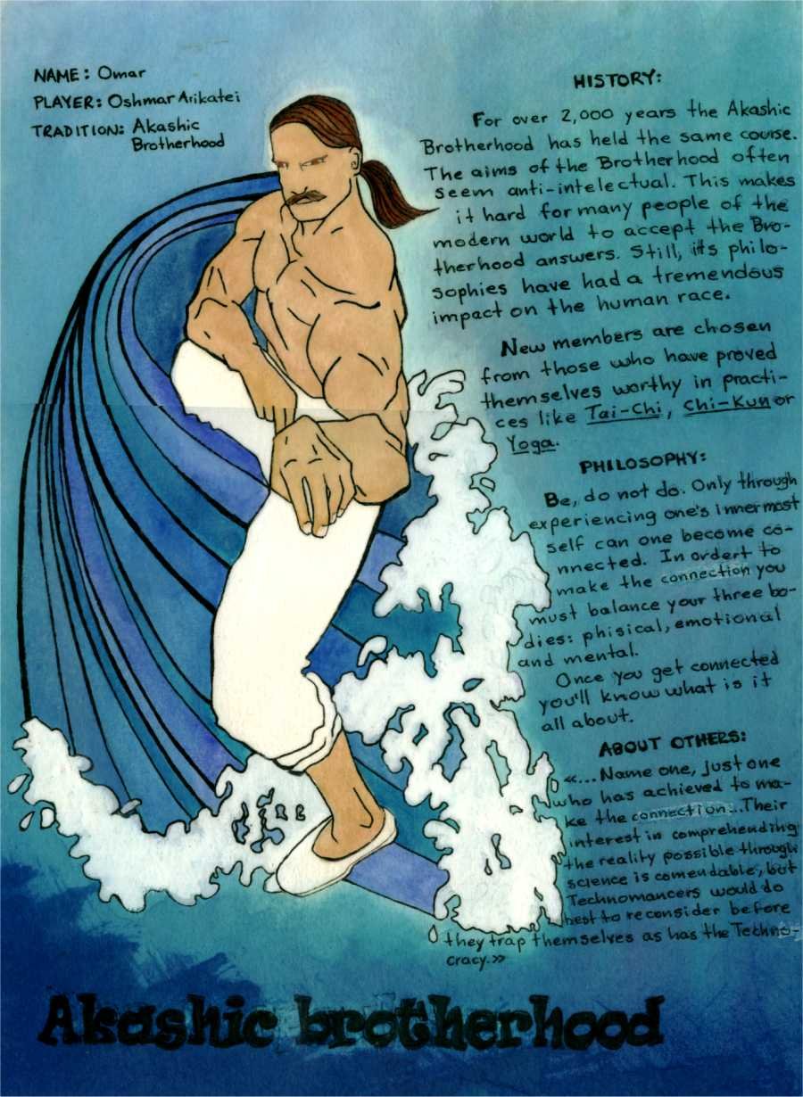 Una de las tradiciones más antiguas es la Hermandad Akáshica que recuerda mucho a los budistas, los yoguis y los practicantes de artes marciales en su empeño por controlar la esfera de la Mente y dominar el cuerpo, sus funciones y pasiones.