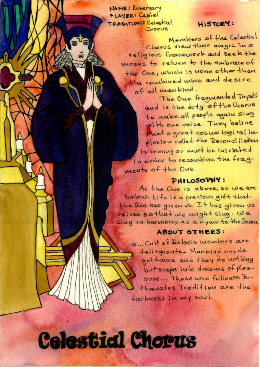 El Coro Celestial recuerda a los místcos cristianos principalmente, aunque en realidad abarca a todas las religiones monoteístas que confían en el poder de los cánticos (como los evangelistas) o de las danzas circulares (como los sufíes). Su idea central es que todos los individuos formamos parte del Uno que es Dios.