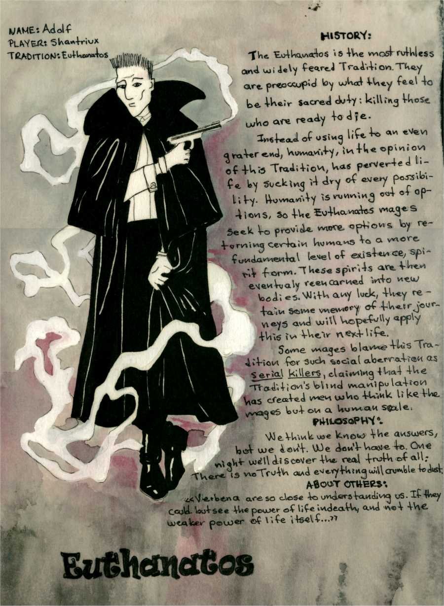 A los Euthanatos, no logro identificarlos con ninguna tradición que yo conozca. Su filosofía se basa en matar a los que consideran perdidos para darles una nueva oportunidad de renacer y empezar de nuevo. La idea es que no contaminen energéticamente al planeta. En casos leves son los que abogan por la eutanasia y en casos extremos se convierten en asesinos seriales que matan por razones de limpieza étnica como Hitler y sus seguidores.