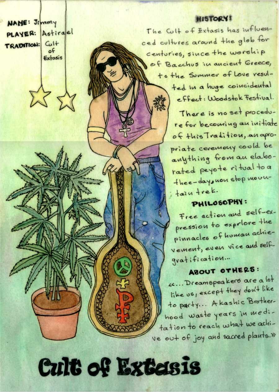 La tradición del Culto del Éxtasis representada por los típicos jipis o los rastafaris, en realiad tiene un origen mucho más antiguo basado en los conceptos de los epicúreos, los hedonistas, los sibaritas y los antiguos sadus dedicados a alcanzar el éxtasis como camino de liberación mediante el sexo, la música y las drogas, principalmente la marihuana.
