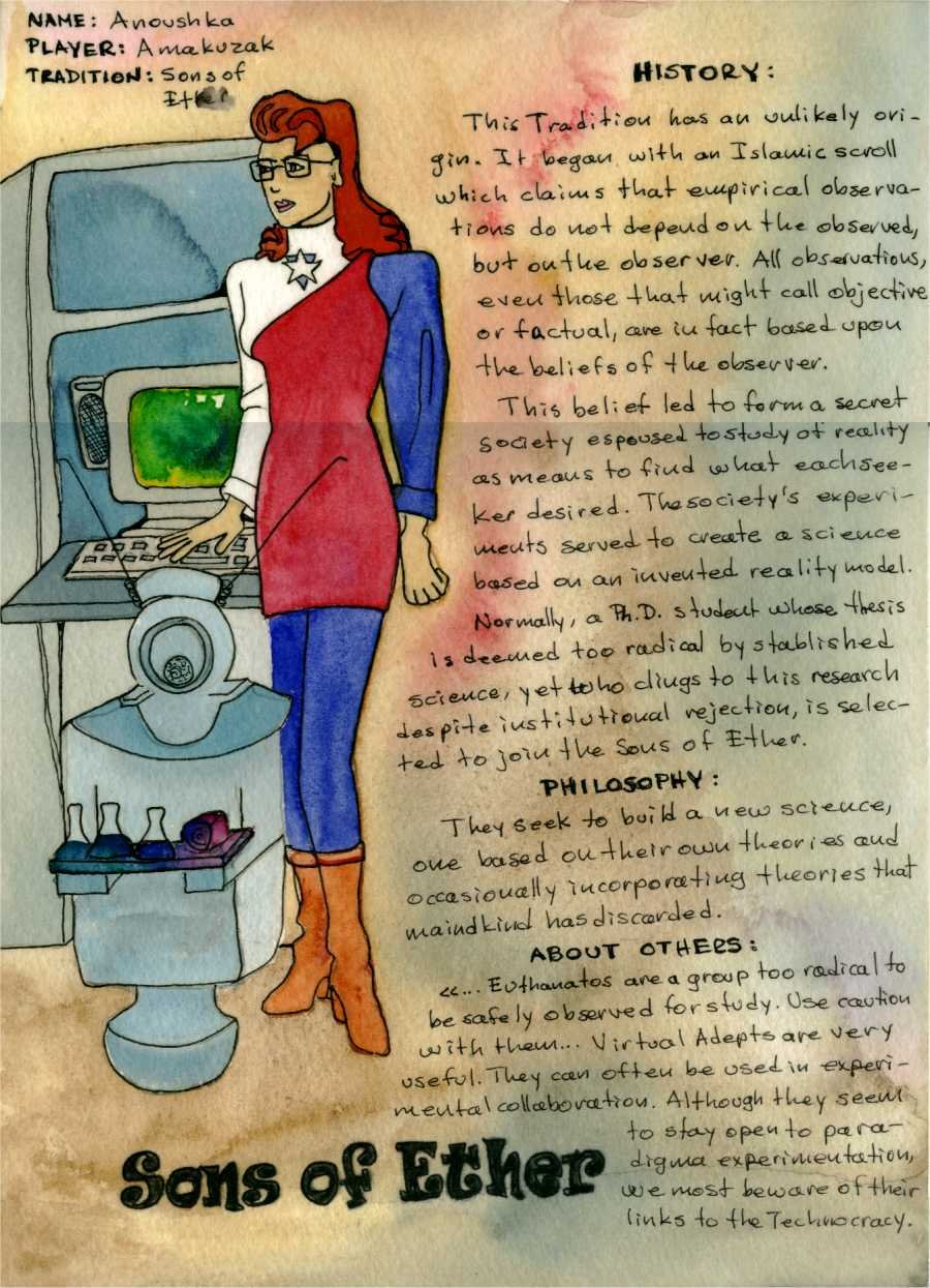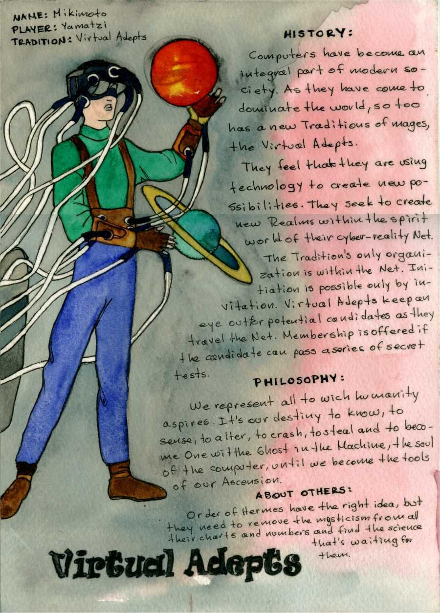 El juego que más me gustaba era Mage: The Ascension (Mago: La Ascensión) porque todos los personajes eran magos que pertenecían a alguna Tradición y que luchaban contra los Tecnomancers que se habían apoderado del planeta donde se desarrollaba el juego, un planeta muy parecido a la Tierra, por cierto...