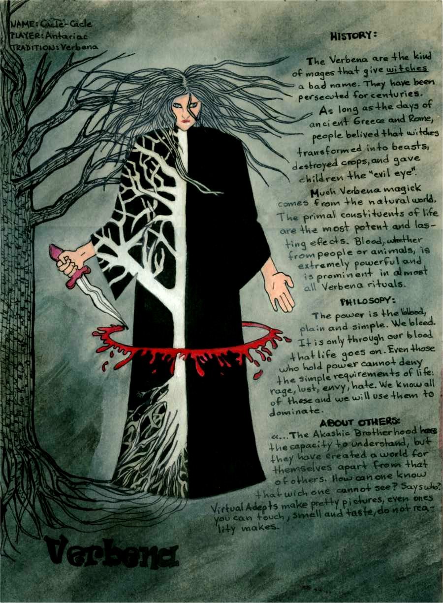 La tradición Vervena recuerda a los druidas celtas, los cultos paganos tipo Wika e incluso la santería contemporánea. Su esfera de influencia es la Vida.