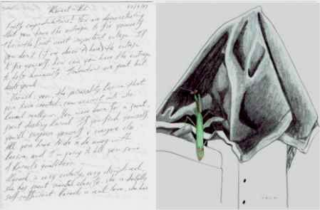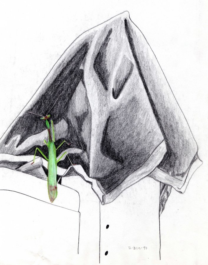 y un dibujo que hice de una mantis que entró a visitarme en mi habitación del