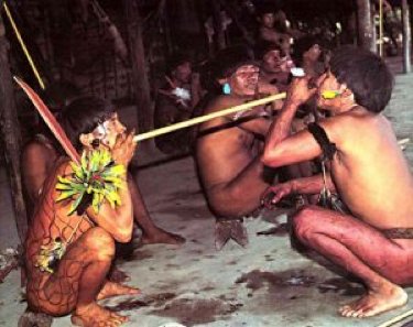 Algunas tribus amazónicas aspiran por la nariz un polvo fino hecho con una planta del amazonas que contiene DMT. Este polvo se prepara con las semillas del árbol del yopo (Anandatera peregrina) que se humedecen, se fermentan y se mezclan con limaduras de caparazones de caracol. Una vez seca la mezcla, se pulveriza finamente y se administra mediante un tubo largo introducido a una fosa nasal en cuyo extremo otra persona sopla fuertemente para hacer llegar el polvo a la nariz. Algunas tribus utilizan tabaco como aditivo del yopo y otros utilizan plantas de la familia Virola en vez de Anandatera.