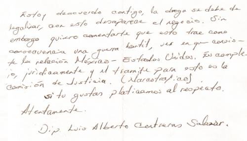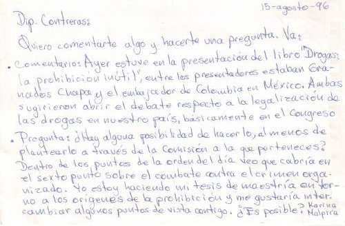 Preocupados por obtener alguna respuesta, durante una reunión de ONGs juveniles que se llevó a cabo el 15 de agosto en la Cámara de Diputados, le pregunté por medio de una nota al Presidente de la Comisión de Asuntos de la Juventud qué posibilidades hay de abrir o al menos de plantear en el Congreso el debate respecto a la despenalización de las drogas.