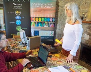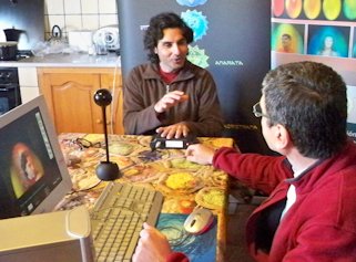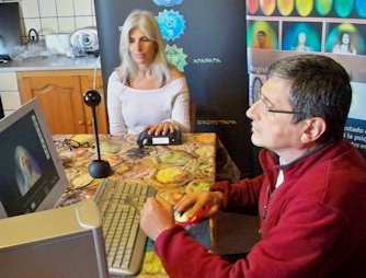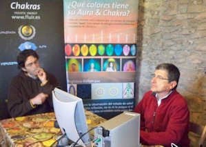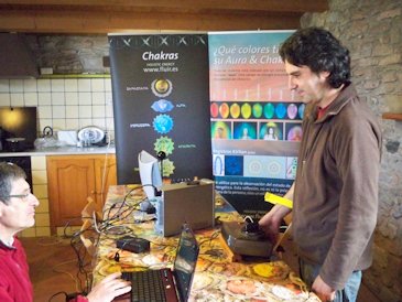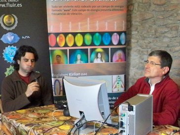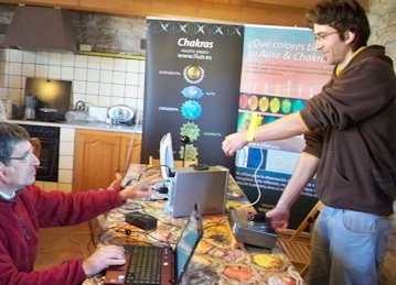 Sitar durante los registros del sistema Kirlian Después de la comida, antes de las segunda ronda de mediciones, expusimos una presentación con los resultados del primer experimento y luego continuamos trabajando. Tomamos las mediciones de Isa, Andrés y Libélula. Flyer no pudo llegar porque tuvo un problema de último momento. Así es que al final sólo tomamos registros de 8 sujetos. Económicamente se notó aún más la crisis y además de bajar el número de participantes, también descendieron las aportaciones de quienes sí asistieron. Afortunadamente Isa y Andrés, los anfitriones de la masía, decidieron no cobrar el alquiler y sólo pagamos los gastos de la comida. Lo que sobró fue para retribuir el trabajo de Xavier Rosique. A quien desafortunadamente no le fue muy bien ese día. Resulta que al final, ya por la noche, llegó París-Dakar de trabajar, dispuesta a hacerse las mediciones y al momento de estarle tomando la medida de base, se estropeó el equipo Kirlian y ahora Xavier tendrá que comunicarse con los técnicos rusos para poder repararla. O sea que en resumen, esta segunda observación ha diferido mucho de la primera, que fue mucho más armoniosa y fluida en comparación a ésta, que estuvo más estresante. A pesar de ello, entre los sujetos experimentales los ánimos se mantuvieron elevados. ¡Realemente gracias a todos por su esfuerzo! Si llegamos a realizar la tercera parte, lo cual depende de (1) que se arregle el sistema Kirlian, (2) que continúen participando los 8 sujetos y (3) que tengamos mayores ingresos para poder realizarlo, realmente habremos llevado a término una pequeña odisea dentro de la investigación independiente... ¡Esperemos que así sea!