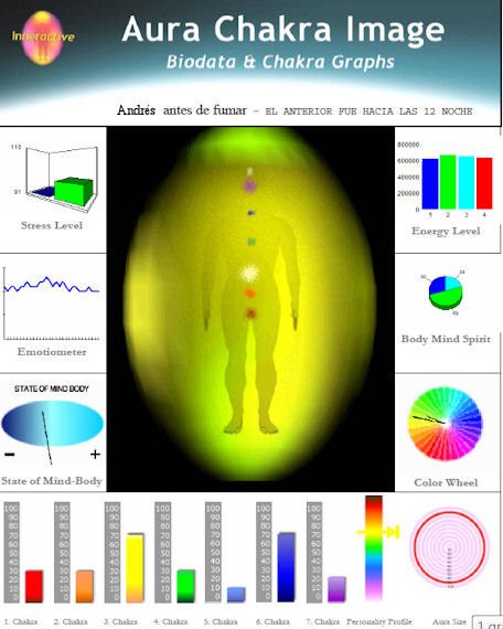El valor más alto se observa en el sexto "chrakra" (60%) y los más bajos en el primero y el tercero (20%), registrándose un promedio de 37.14% en el potencial de uso del conjunto de sus 7 centros energéticos. Lo cual no representa ninguna variación con respecto al promedio del año anterior antes de fumar (medidas de base) que era también de 37.14%.