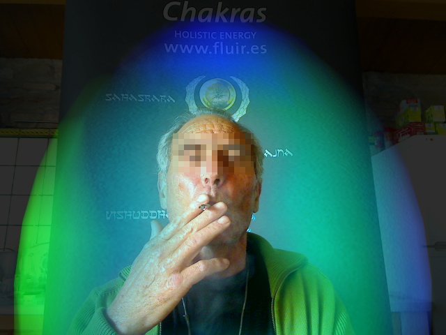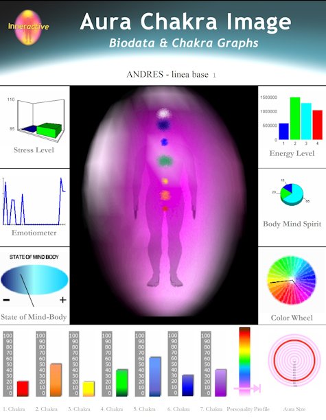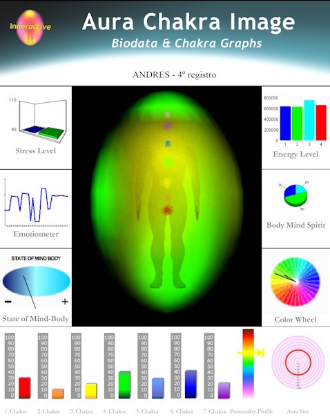 Una hora después, el aura ha vuelto a cambiar de color. El primer "Chakra" aumenta 10 puntos. Bajan el sexto (10 puntos menos), el segundo (menos 20) y el séptimo (menos 40). Los demás permanecen sin variaición.
