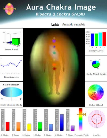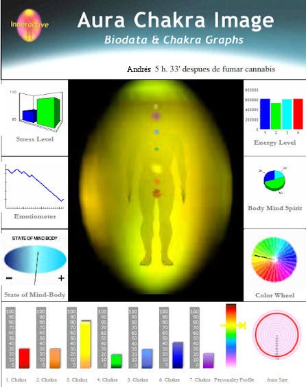 Mientras inhala Cannabis, se observa un cambio en los colores del "aura", así como un descenso en los valores del "chakra" séptimo (20 puntos menos). El primero y el segundo "chakras" permanecen igual, mientras que los demás aumentan: el sexto sube 30 puntos, el tercero, cuarto y quinto 10 puntos más, respectivamente.