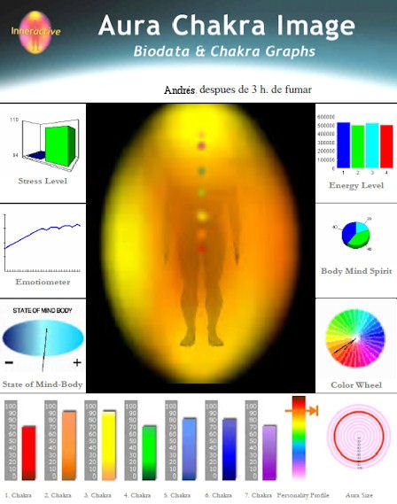 En la última medición, aproximadamente 5 horas después, han descendido drásticamente los valores de todos los "chakras", el tercero refleja 10 puntos menos; el primero y sexto 40 puntos menos; el cuarto, quinto y séptimo 50 puntos menos y el segundo 60 puntos menos. Lo cual demuestra que, pasados los principales efectos, han disminuido los valores de todos los "chakras" en relación a la medida de base en 1.42 puntos menos, considerándose negativa la utilización del Cannabis por parte del sujeto experimental que eligió el seudónimo de Andrés. Esto en lo que respecta a las mediciones llevadas a cabo con el Sistema Auravisión.