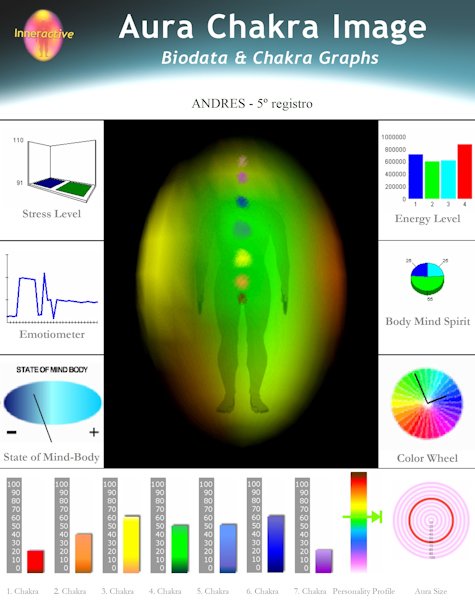 Las mediciones para todas las variables registradas como "chakras" por el sistema Auravisión fluctuaron durante el transcurso de los efectos. No obstante, la última medición reporta valores mayores que los de la medida inicial para las variables de tercero y sexto "chakras", y muestra valores menores para el quinto y séptimo chakras, mientras que los valores finales de los demás se quedan igual que los del principio, lo cual en promedio representa un aumento de 5,71 puntos en las últimas mediciones con relación a las de base. Por lo tanto puede considerarse que esta persona ha tenido una afectación positiva. Considerando que la primera vez sus registros bajaron 1,42 puntos y ésta vez subieron 5,71 podríamos decir que esta vez a Andrés le ha ido mejor fumar Cannabis.