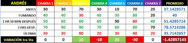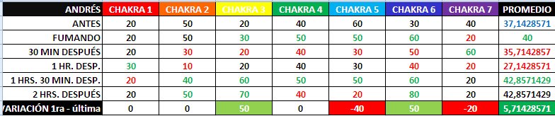 Lo cual pone en evidencia que, pasados los principales efectos, el promedio de la suma de los valores de todos los "chakras" ha aumentado 5,71 puntos en relación a la medida de base, considerándose positiva la utilización del Cannabis en el sujeto experimental que eligió el seudónimo de Andrés. Esto en lo que respecta a las mediciones llevadas a cabo con el Sistema Auravisión.