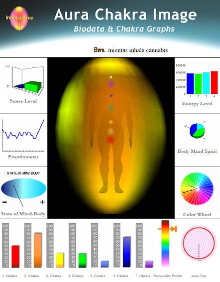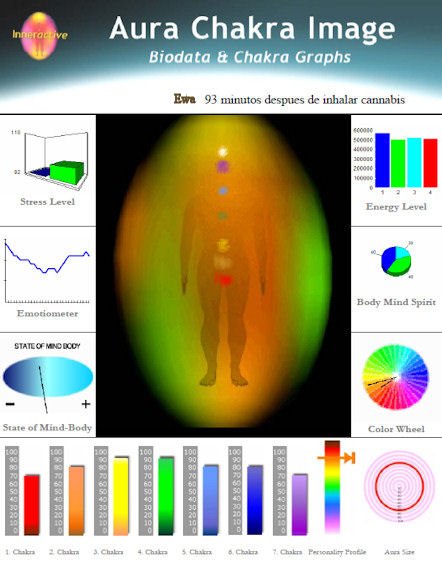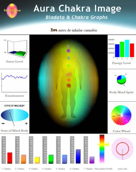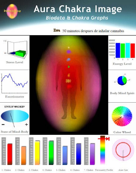 Mientra inhala Cannabis, se observa un cambio en los colores del "aura", así como un aumento importante en los valores de los "chrakras" primero (10 puntos más), segundo (50 puntos más) y sexto (20 puntos más); al mismo tiempo que descienden el quinto y el séptimo (20 y 10 puntos menos respectivamente). El tercero y el cuarto permanecen iguales.