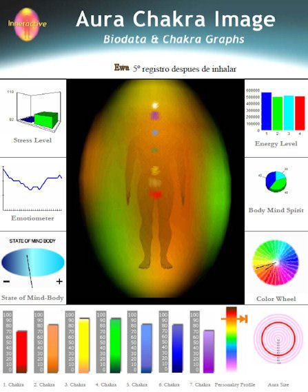 93 minutos después, el aura ha cambiado nuevamente sus colores, han descendido los valores del primer y séptimo "chakras" (10 puntos menos cada uno), han aumentado el segundo y el quinto "chakras" (10 puntos más respectivamente) y los demás permanecen sin variación.