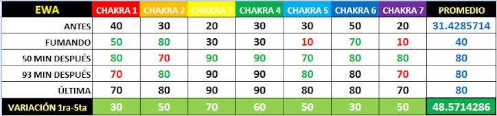 La última medición, aproximadamente 3 horas después, no representa ninguna variación con respecto a la anterior; lo cual demuestra que, pasados los principales efectos, se conserva el aumento en los valores de todos los "chakras" en relación a la medida de base, considerándose bastante positiva la utilización del Cannabis por primera vez en el sujeto experimental que eligió el seudónimo de Ewa. Esto en lo que respecta a las mediciones llevadas a cabo con el Sistema Auravisión.