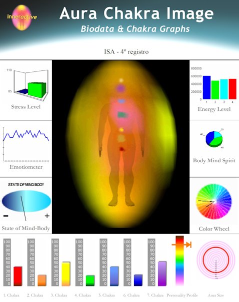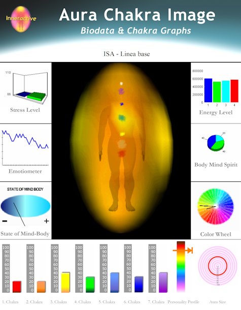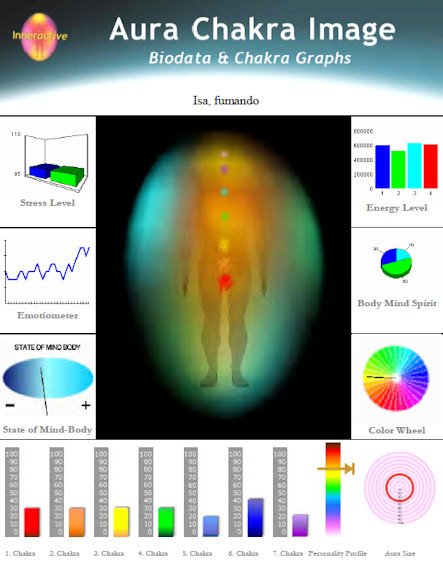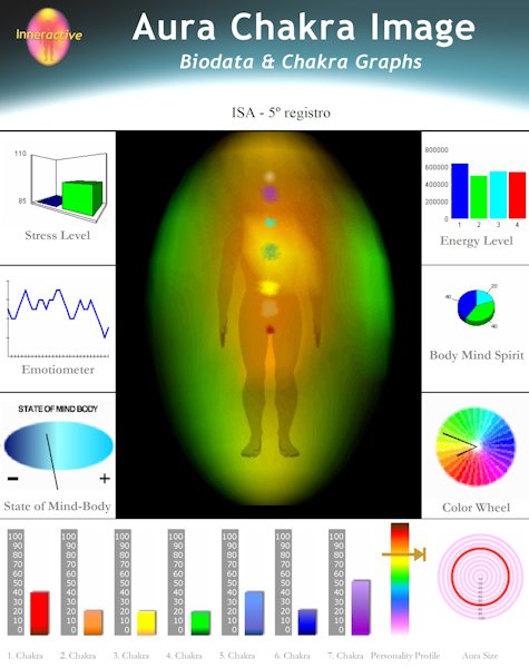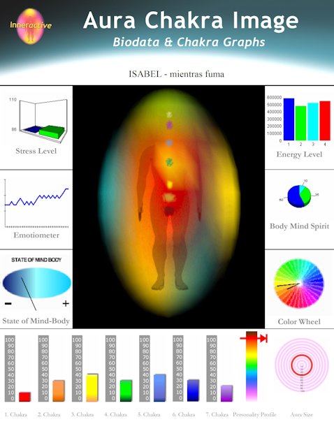 Nuevamente el aura ha cambiado de color. El segundo y tercer "chakras" bajan un poco (10 puntos menos respectivamente). El tercero y el séptimo permanecen sin cambios y primero, cuarto y sexto aumentan en la misma proporción (20 puntos más cada uno).
