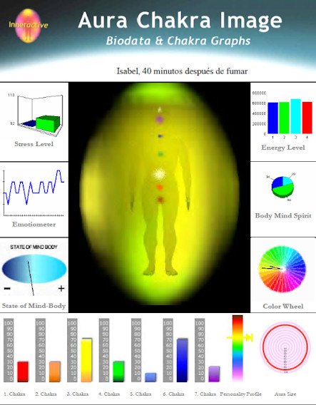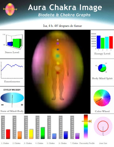 Una hora después, el aura ha vuelto a cambiar de color. El cuarto y el sexto "chakras" disminuyen 20 puntos cada uno. El primero y el quinto suben 10 puntos respectivamente. El séptimo aumenta 30 puntos. El segundo y el tercero continúan igual.
