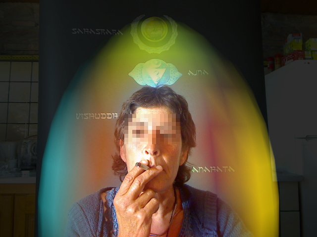 Mientras inhala Cannabis, se observa un cambio en los colores del "aura", así como un leve descenso en los valores del "chakra" primero (10 puntos menos) y uno más pronunciad en el séptimo (20 puntos menos), mientras que el segundo aumenta levemente (10 puntos más).