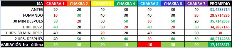 Lo cual pone en evidencia que, pasados los principales efectos, el promedio de la suma de los valores de todos los "chakras" ha aumentado 17,14 puntos en relación a la medida de base, considerándose positiva la utilización del Cannabis en el sujeto experimental que eligió el seudónimo de Isa. Esto en lo que respecta a las mediciones llevadas a cabo con el Sistema Auravisión.