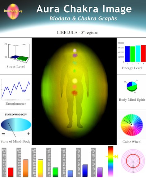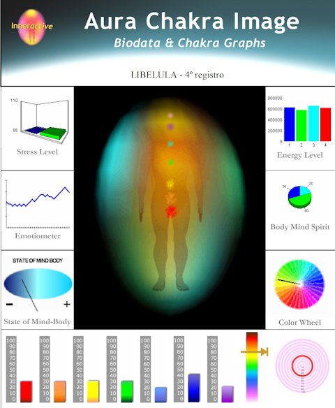 Media hora después, nuevamente el aura ha cambiado de color. El primer y el cuarto "chakras" baja un poco (10 puntos menos cada uno). El quinto y sexto aumentan 10 puntos respectivamente, el séptimo sube 40 puntos y los demás descienden en distinta proporción: el primero y el cuarto 10 puntos menos, el tercero 20 puntos menos y el segundo 40 puntos menos