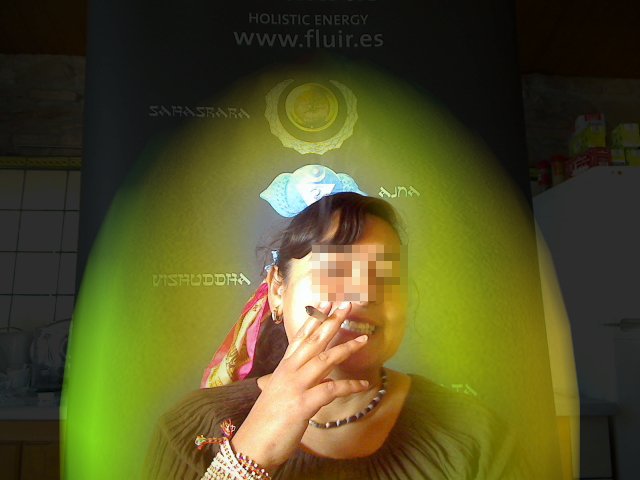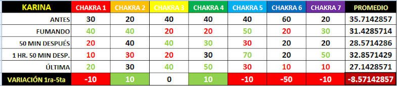 Mientra inhala Cannabis, se observa un cambio en los colores del "aura", así como un leve aumento en los valores de los "chrakras" primero, quinto y séptimo (10 puntos más cada uno), el segundo subió un poco más (20 puntos más); al mismo tiempo descienden el tercero y el cuarto (20 puntos menos) y el sexto bajó bastante más (40 puntos menos).