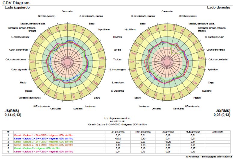 Resultados del análisis mediante el SISTEMA KIRLIAN (gdv)