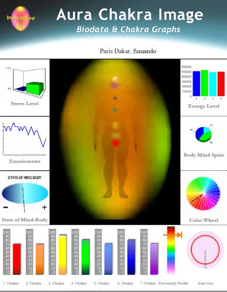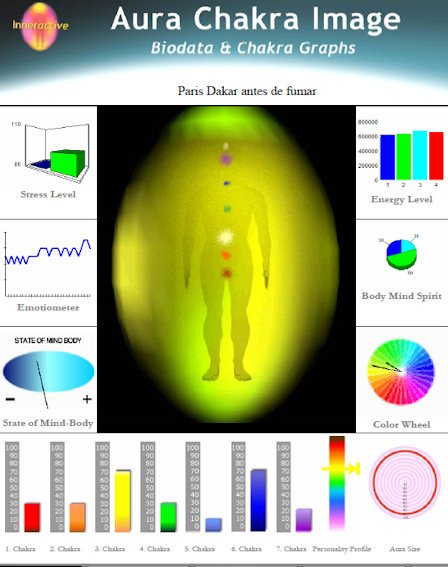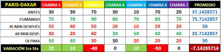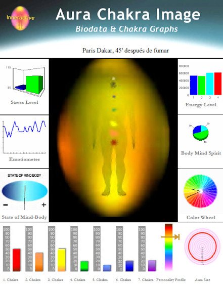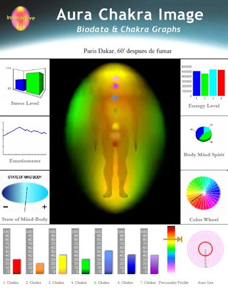 En la última medición, aproximadamente 4 horas después, han descendido los valores de 4 "chakras", el tercero baja 10 puntos, el sexto y el séptimo 20 puntos menos y el quinto 30 puntos menos; el primero y el segundo suben 20 puntos cada uno y el cuarto permanece sin cambio. El promedio de los valores de cada "chakra" en esta última medición es 7.14 puntos inferior respecto a la medida de base, considerándose negativa la utilización del Cannabis por parte del sujeto experimental que eligió el seudónimo de Paris-Dakar. Esto en lo que respecta a las mediciones llevadas a cabo con el Sistema Auravisión.