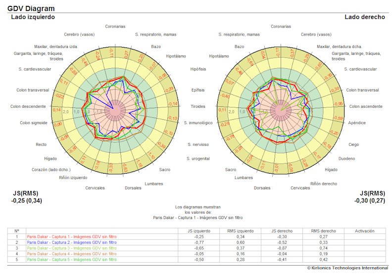 Todas las medidas se encuentran dentro del círculo verde, que representa la normalidad, excepto las áreas relacionadas con la garganta, el sistema inmunológico y otras, que se salen levemente de estos parámetros, lo cual significa una alteración fisiológica de acuerdo a estas correlaciones entre los registros del "aura" de los dedos y los órganos corporales, sin embargo, prácticamente todos estos valores vuelven a la normalidad en el último registro.