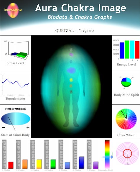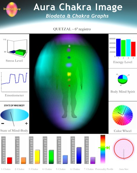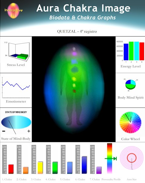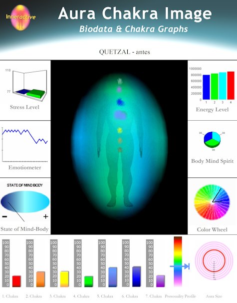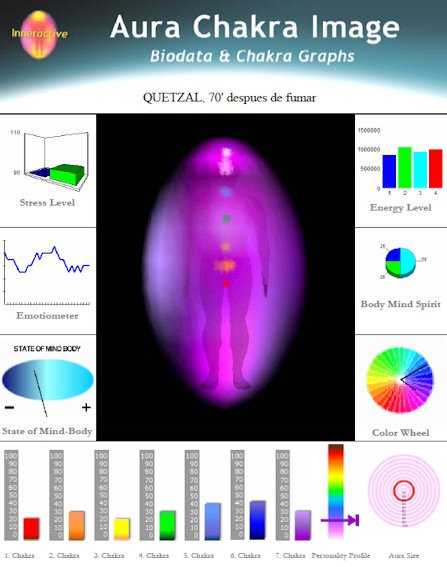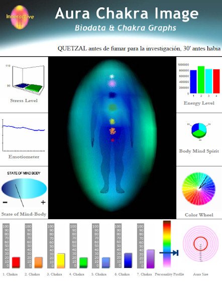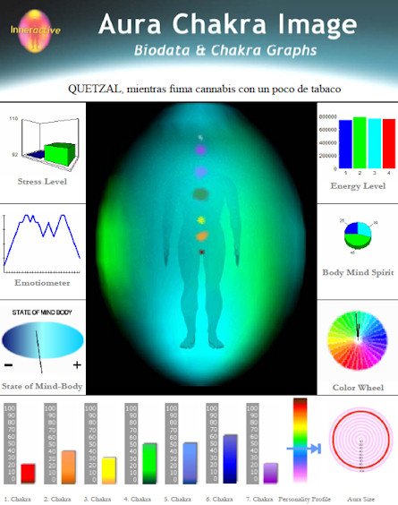 La última medición, un poco más de una hora después, el color del "aura" se ha vuelto a modificar, el primero y el séptimo "chakras" descienden un poco (10 puntos), el tercero baja más (30 puntos), suben levemente el segundo, cuarto y sexto (10 puntos más) y sube más el quinto (20 puntos). El promedio final es 4.28 puntos mayor que el inicial; lo cual demuestra que los efectos positivos continúan, considerándose positiva la utilización del Cannabis en el sujeto experimental que eligió el seudónimo de Quetzal. Esto en lo que respecta a las mediciones llevadas a cabo con el Sistema Auravisión. (Cabe notar que Quetzal no pudo quedarse a la quinta y última medición que planeamos para todos los sujetos experimentales, por lo que no contamos con el registro de sus valores ya fuera de los efectos del Cannabis.)
