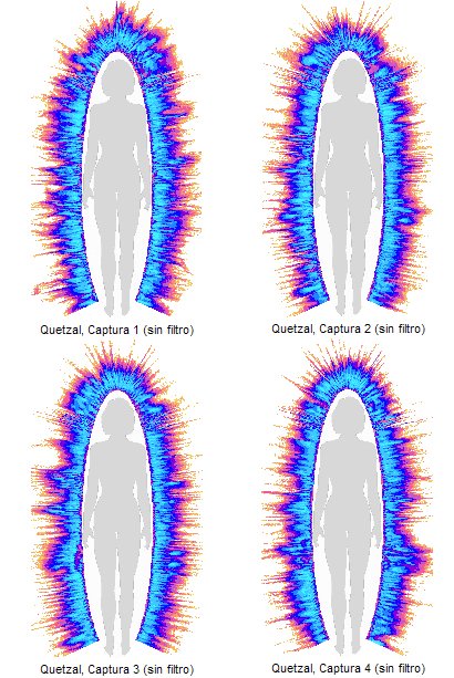 Las mediciones para todas las variables registradas como "chakras" por el sistema Auravisión fluctuaron durante el transcurso de los efectos. No obstante, la última medición reporta valores mayores que los de la medida inicial para el promedio de todas las variables, por lo tanto puede considerarse que esta persona ha vuelto a tener una afectación positiva. Considerando que la primera vez sus registros aumentaron 4,28 puntos y ésta vez 7,14 podríamos decir que a Quetzal, su forma y frecuencia de consumo, le sigue afectando de manera positiva.