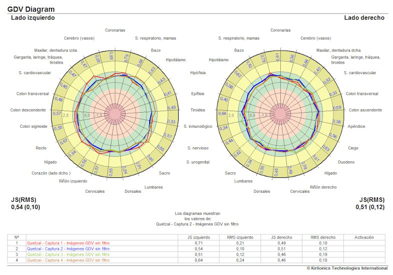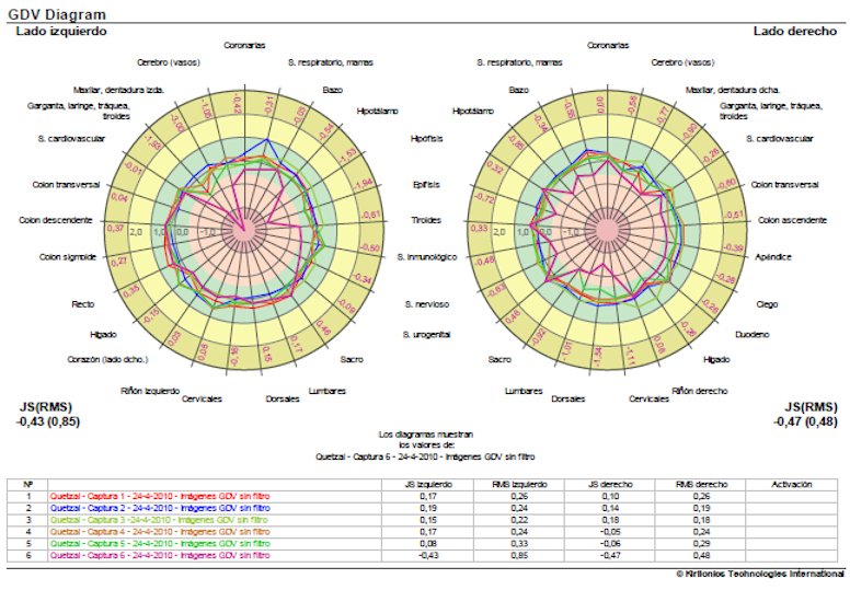 Todas las medidas se encuentran dentro del círculo verde, que representa la normalidad, lo cual significa que no hay ninguna alteración fisiológica importante de acuerdo a estas correlaciones entre los registros del "aura" de los dedos y los órganos corporales.