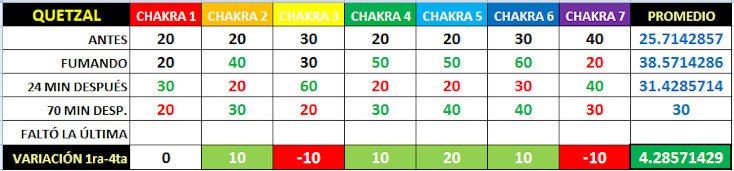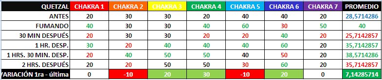 Lo cual pone en evidencia que, pasados los principales efectos, el promedio de la suma de los valores de todos los "chakras" ha aumentado 7,14 puntos en relación a la medida de base, considerándose positiva la utilización del Cannabis en el sujeto experimental que eligió el seudónimo de Quetzal. Esto en lo que respecta a las mediciones llevadas a cabo con el Sistema Auravisión.