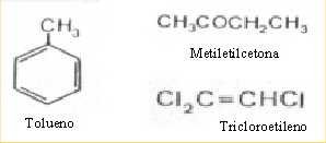 Los solventes industriales de mayor uso en México son los cementos (tricloroetileno, tetracloroetileno), los pegamentos (tolueno, acetato de etilo y varias acetonas), el thíner (destilados de petróleo, benzeno, acetona, tricloroetileno, tetracloroetileno) y los removedores de barniz o pintura (acetona, tolueno, benzeno, cloruro de metileno). Imagenes tomadas del "Manual de identificación de estupefacientes" combinada con otra imagen de una web de servicio público